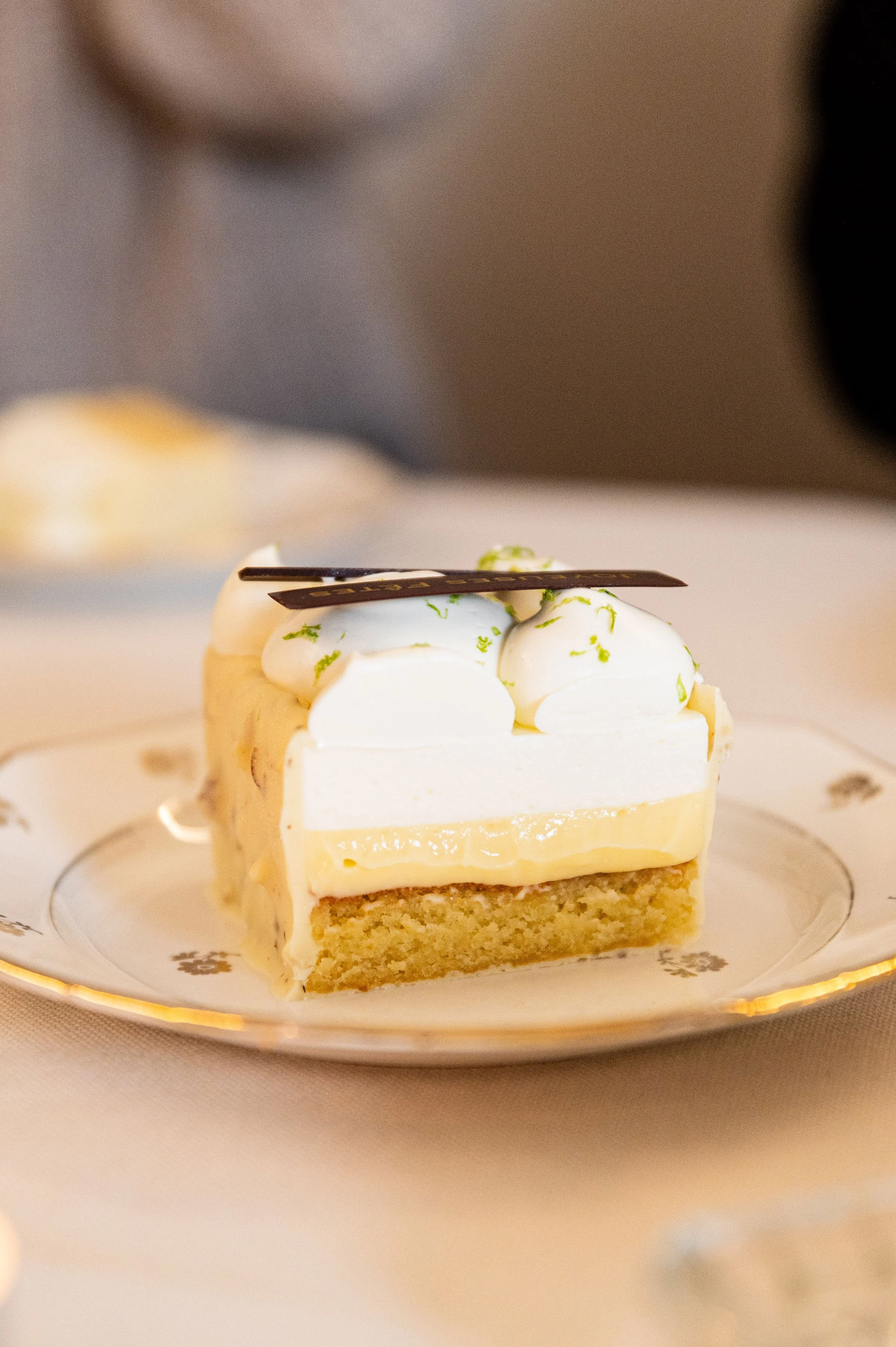 Biscuit sans gluten aux amandes et au citron, crémeux citron jaune, mousse fromage blanc, mousse citron vert